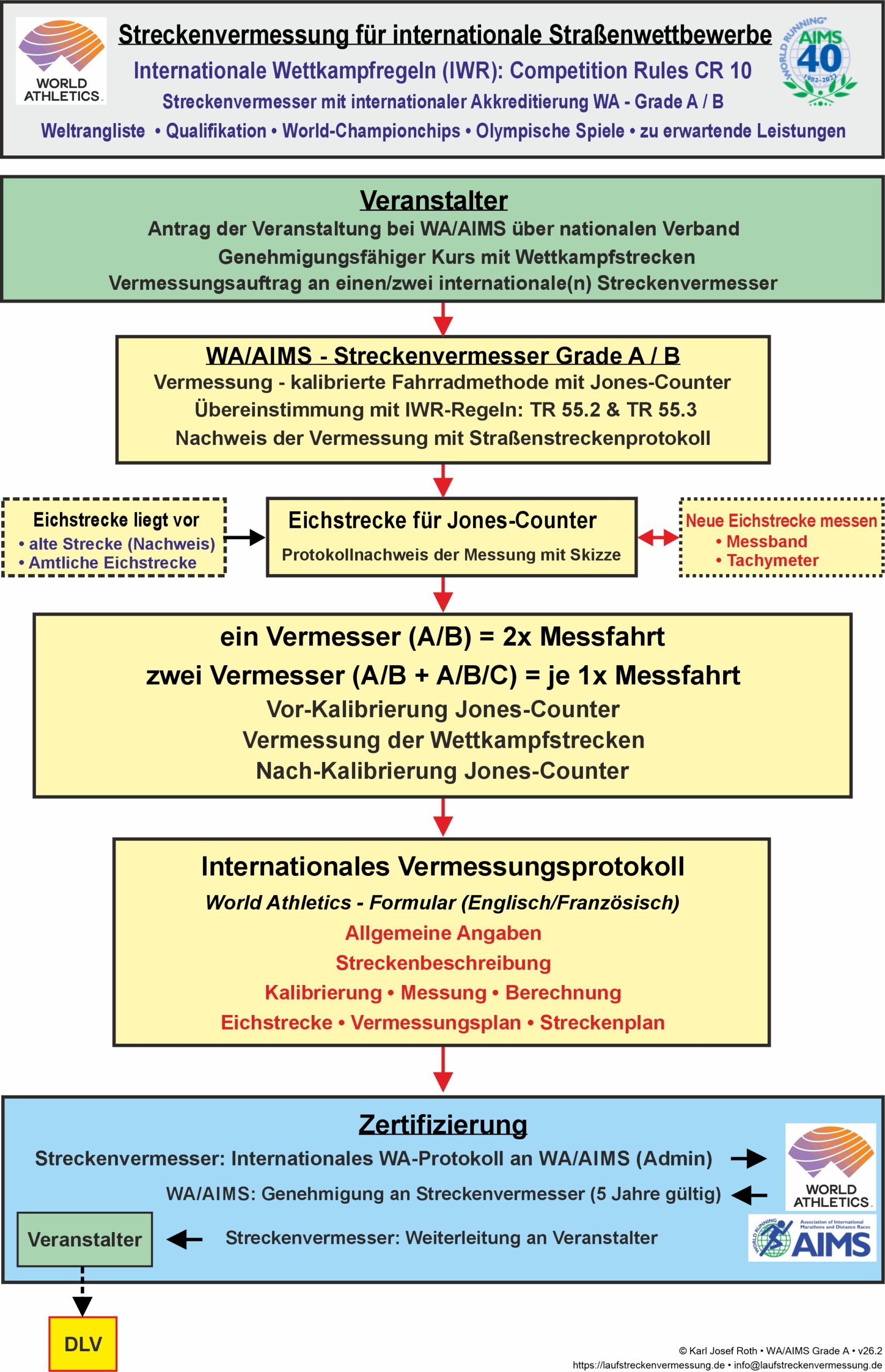 World Athletics (WA) organisiert in seiner Funktion als Weltverband auf der Grundlage des Regelwerks den Einsatz von internationalen Streckenvermesser mit Hilfe der Vereinigung der internationalen Marathonveranstalter und Langstrecken (AIMS). WA akkreditiert die int. Streckenvermesser (Grade A + B) auf Vorschlag von AIMS. Die AIMS ist verantwortlich für die Aus- und Fortbildung in Seminaren aller weltweit agierenden Streckenvermesser, und zwar in Abstimmung mit allen nationalen Verbänden und empfiehlt diesen die Akkreditierung der nationalen Streckenvermesser. Sie überwacht die regelbasierte Durchführung der Streckenvermessungen auf internationaler Ebene und zertifiziert mit Hilfe der vier Administratoren die vermessenen Strecken: